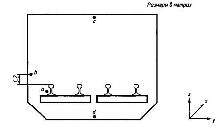Рисунок 1 - Измерительные точки в плане поперечного сечения туннеля в зависимости от типа испытаний Размещение измерительных точек на рисунке 1 дано в предположении, что поезд движется по левой колее. Для проведения полных и сокращенных испытаний (см. 9.1 и 9.2) датчики должны быть установлены: - на перевернутом своде в месте пересечения с вертикальной центральной линией в поперечной плоскости сечения (точка с/на рисунке 1), между двумя шпалами, если рельсы положены на балластный слой, или между двумя последовательно идущими точками крепления (костылями) при других устройствах пути; - на своде туннеля (точка с на рисунке 1) непосредственно над точкой d; - на стене туннеля с той стороны, где движется поезд, на высоте 1,2 м над уровнем рельсов (точка b на рисунке 1). Для того чтобы оценить соотношение между вибрацией поезда как источника возбуждения и вибрацией, передаваемой им на конструкцию туннеля, необходимо провести измерения на подошве рельса в плоскости, перпендикулярной к плоскости рельса (точка а на рисунке 1). Вибрация в точке а подвержена влиянию локальных эффектов, поэтому, прежде чем выбрать эту точку в качестве контрольной при проведении сокращенных испытаний, необходимо убедиться в типичности и стабильности вибрации в этой точке. При установке датчика следует принять во внимание наклон подошвы рельса (см. рисунок 2). Если точка на перевернутом своде недоступна, датчик помещают в ближайшей подходящей точке с указанием всех элементов, расположенных между датчиком и точкой на перевернутом своде. При проведении полных испытаний (см. 9.1) измерения проводят также в двух других сечениях, удаленных от среднего сечения обычно на 20 м, для того чтобы минимизировать влияние локальных эффектов. Однако в случаях, когда сигнал, полученный в двух соответствующих точках в двух сечениях, отстоящих друг от друга на 20 м, одинаков, допускается проводить измерения только для одного сечения. Если же между результатами этих измерений существует систематическое расхождение, превышающее 25 % (2 дБ), их отбрасывают и рассматривают вибрацию в третьем сечении. В случае расхождения результатов, полученных во всех трех сечениях, следует проверить влияние, которое оказывают на эти результаты локальные условия измерений, и выбрать другие сечения для проведения измерений. 6.2 Крепление датчиковДатчики должны быть установлены таким образом, чтобы влияние системы крепления на вибрацию элементов конструкции было минимальным (см. ГОСТ ИСО 5348). Для выполнения данного требования крепление датчиков должно быть максимально жестким и легким. При креплении датчика на подошву рельса между ней и датчиком помещают стальной переходник, устанавливаемый на рельс так, чтобы обеспечить максимальную жесткость соединения (желательно сваркой). Этот переходник обеспечивает перпендикулярность измерительной оси датчика к подошве рельса (см. рисунок 2).