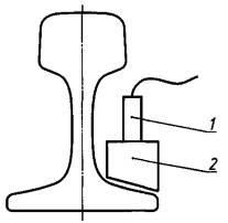 1 - датчик; 2-переходник Рисунок 2 - Точка измерения на подошве рельса Очень важно, чтобы система, состоящая из датчика, опоры и крепящих болтов, имела частоту установочного резонанса, намного превышающую верхнюю границу диапазона частот измерений (см. ГОСТ ИСО 5348). Следует иметь в виду, что акселерометры могут быть весьма чувствительными к колебаниям воздуха, вызываемым прохождением поездов. Поэтому необходимо обеспечить их защиту от воздушной струи. 6.3 Отношение сигнал/шумФоновый шум целесообразно измерять в отсутствие основного источника вибрации. Например, при исследовании вибрации, вызываемой прохождением поезда, следует записать и тем же способом обработать сигнал, когда поезда в туннеле нет. После этого полученные результаты сравнивают для определения отношения сигнал/шум (С/Ш). Если сигнал превышает (по амплитуде) шум более чем в три раза (С/Ш > 10 дБ), коррекцию в результаты измерений можно не вносить. Если отношение между сигналами составляет от двух до трех (6 дБ £ С/Ш £ 10 дБ), в результаты измерений необходимо внести поправку, о чем должна быть сделана отметка в протоколе испытаний. Если сигнал превышает шум менее чем в два раза (С/Ш < 6 дБ), результаты измерений не являются достоверными и могут быть только приняты к сведению. 7 Средства измеренийС точки зрения корректности оценки вибрации весьма важным моментом является выбор датчиков [1]. Его следует делать с учетом того, какой параметр вибрации должен быть измерен, а также с учетом амплитудного и частотного (см. 4.2) диапазонов измерений и воздействия факторов среды, в которой датчик должен работать. Особенно важны амплитудная и фазовая характеристики датчика и передаточная функция интегратора, разброс в значениях которых может привести к получению различных результатов для одного и того же входного вибрационного воздействия. При измерениях вибрации рельсов применяют, как правило, акселерометры, а в других измерительных точках могут быть использованы датчики скорости с собственной частотой ниже минимальной частоты диапазона измерений. Калибровку измерительной цепи следует проводить до и после серии измерений, и по крайней мере каждые 2 года элементы измерительной цепи должны проходить поверку в аккредитованной лаборатории с получением соответствующего сертификата. Все измеренные значения составляющих сигнала виброскорости (в миллиметрах в секунду) вместе с их частотами (в герцах) должны быть отражены в протоколе испытаний. Если виброскорость измеряют в децибелах, в качестве опорного значения следует принять 10-6 мм/с1). 1) Данное опорное значение отличается от того, что используется в стандартах, посвященных оценке воздействия вибрации на человека (см. ГОСТ 12.1.012). Во избежание недоразумений рекомендуется всегда указывать, какое именно значение взято в качестве опорного. При необходимости сравнения результатов, полученных с помощью датчика скорости и акселерометра, для последнего должно быть осуществлено интегрирование - желательно в цифровом виде. Аналоговое интегрирование, например посредством фильтра низких частот, может привести к разбросу получаемых результатов, который будет зависеть от значений амплитуд и фаз составляющих исходного сигнала, а также передаточной функции интегратора. Если ускорение измеряют в децибелах, опорное значение должно быть р
