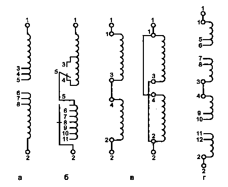 а - обмотка фазы с ответвлениями посредине; б - обмотка фазы с грубой и тонкой ступенями регулирования на одном конце обмотки; в - обмотка фазы, состоящая из двух частей, соединяемых последовательно или параллельно; г - обмотка фазы, состоящая из двух частей, соединенных последовательно, каждая из которых посредине ответвления