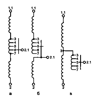 а - обмотка с ответвлениями, помещенная между последовательной и общей обмотками; б - обмотка с ответвлениями, помещенная в конце последовательной обмотки; в - обмотка с ответвлениями, один конец которой подключен к соединению между последовательной и общей обмотками
