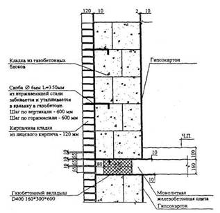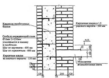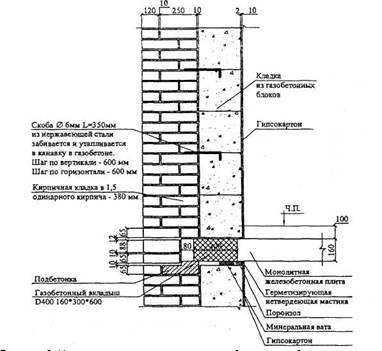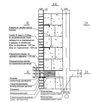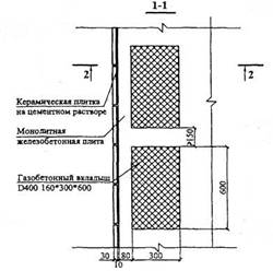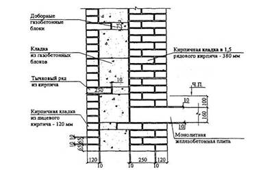 6.2. Общие положения по конструированию и применению стен из блоков 6.2.1. Настоящий РМД распространяется на применение стеновых мелких блоков из ячеистых бетонов автоклавного и неавтоклавного твердения в жилых и общественных зданиях Санкт-Петербурга. 6.2.2. Проектирование стен из блоков следует выполнять по СНиП II-22 (табл. 5), Пособию к СНиП 2.03.01 и настоящему РМД. 6.2.3. Блоки стеновые мелкие из автоклавных и неавтоклавных ячеистых бетонов предназначены для кладки наружных и внутренних стен и перегородок жилых и общественных зданий с относительной влажностью воздуха помещений не более 75 % при неагрессивной среде. 6.2.4. Применение блоков из ячеистых бетонов для кладки стен с мокрым режимом помещений, а также в местах, где возможно усиленное увлажнение бетона или наличие агрессивных сред, без специальной защиты не допускается. 6.2.5. Расчет элементов стен из блоков по предельным состояниям первой и второй группы следует производить в соответствии с требованиями СНиП II-22 или настоящего РМД; стены могут быть несущими, самонесущими и ненесущими (навесными). 6.2.6. Допустимую высоту (этажность) стен из блоков рекомендуется определять расчетом несущей способности наружных и внутренних стен с учетом их совместной работы. 6.2.7. Несущие стены из автоклавных ячеистобетонных блоков рекомендуется возводить высотой до 5-ти этажей включительно, но не более 20 м, в самонесущих стенах зданий высотой до 9-ти этажей включительно, но не более 30 м. 6.2.8. Блоки из неавтоклавных ячеистых бетонов рекомендуется применять в несущих и самонесущих стенах зданий высотой до 3-х этажей включительно, но не выше 10 м. 6.2.9. Этажность зданий, в которых применяются блоки для заполнения каркасов (фахверков) или кладки ненесущих (навесных) стен, не ограничивается. 6.2.10. Внутренние и наружные несущие стены зданий высотой до 5-ти этажей рекомендуется изготавливать из блоков классов по прочности не ниже В3,5 (только автоклавных); при высоте зданий до 3-х этажей - не ниже B2,5; при высоте до 2-х этажей - не ниже B2. Для самонесущих и ненесущих (навесных) стен зданий высотой более 3-х этажей класс блоков - не ниже B2,5, а высотой до 3-х этажей - не ниже B2. 6.2.11. Допустимая ширина простенков, выполненных из газобетонных блоков, определяется расчетным путем по СНиП II-22, но не менее 600 мм в несущих стенах и не менее 300 мм в самонесущих и навесных. 6.3. Конструкции наружных многослойных стен с применением ячеистобетонных блоков, кирпича и монолитного бетона 6.3.1. Наружные многослойные стены (далее стены) применяются в кирпично-монолитных домах, в которых теплозащитные качества стен обеспечиваются применением мелких ячеистобетонных блоков по номенклатуре ГОСТ 21520. Применение блоков других параметров должно быть согласовано Ростехнормированием или иными уполномоченными организациями. 6.3.2. Наружные стены подразделяются на несущие, навесные и самонесущие. 6.3.3. К несущим относятся стены, воспринимающие нагрузку от междуэтажных перекрытий. В несущих стенах нагрузка от перекрытий может восприниматься - монолитным слоем из тяжелого бетона (рис. 1, 2, 3); - кирпичным внутренним слоем (рис. 4, 5); - кирпичным наружным слоем (рис. 6); - ячеистобетонной кладкой (рис. 7); - рамно-монолитным каркасом из тяжелого бетона (рис. 8). 6.3.4. Расчет элементов несущих стен по предельным состояниям первой и второй группы следует производить в соотв