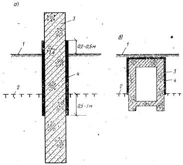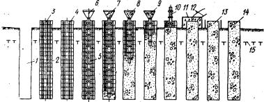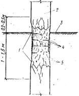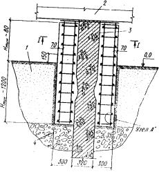 Рис. 11. Свайно-столбчатый фундамент 6.67. При проектировании основания по I принципу образовавшийся зазор между сваей (столбом) и стенкой скважины заполняется известково-песчаным, цементно-песчаным, грунтовым или глинисто-песчаным раствором. 6.68. При проектировании основания по II принципу к материалу, заполняющему зазор, образовавшийся между поверхностями скважины и сваи (столба), по его длине предъявляются разные требования. В нижней части скважины, так называемой расчетной зоне заделки, кольцевой зазор омоноличивают раствором, к которому предъявляют требования по прочности, плотному заполнению зазора, и хорошему сцеплению с поверхностями скважины и сваи (столба). Марка раствора устанавливается проектом сооружения. При отсутствии в проекте рекомендаций о марке раствора ее принимают не ниже М 100. Разрешается для получения требуемой прочности в ранние срока назначать марку раствора выше проектной. На участке скважины от верха расчетной зоны заделки до нижней отметки деятельного слоя кольцевой зазор омоноличивают раствором, к которому предъявляют требования по обеспечению плотного заполнения зазора. Марка раствора назначается не ниже М 50. Зазор в пределах деятельного слоя заполняют местным грунтом или сухим песком. К засыпке пазухи в этой зоне предъявляют требования по обеспечению плотного заполнения зазора. 6.69. Зазор на участке расчетной зоны заделки омоноличивается по методу вытеснения (выдавливания) растворной смеси в кольцевой зазор под действием веса сваи (столба). 6.70. Для омоноличивания зазора на участке расчетной зоны заделки применяются цементно-песчаная, цементно-шламо-песчаная и цементно-шламовая растворные смеси. Цементно-песчаная растворная смесь приготавливается в смесителях и подается на дно скважины. Цементно-шламо-песчаный и цементно-шламовый растворы используются в том случае, если проходка скважин осуществляется станками ударно-канатного бурения, при применении которых на дне скважины образуется слой трудноизвлекаемого бурового шлама, представляющего собой взвешенные в воде куски раздробленной породы и технологически необходимый при бурении цемент или бентонитовую глину. Цементно-шламо-песчаные и цементно-шламовые растворные смеси приготовляются на дне скважины с добавлением в остающийся на забое слой шлама, цемента, песка или одного цемента. Для омоноличивания столбов под опоры мостов цементно-шламовый раствор не применяется. 6.71. Сваи (столбы) в скважине на участке от верха расчетной зоны заделки до низа слоя омоноличиваются либо по методу вытеснения растворной смеси в кольцевой зазор под действием веса сваи (столба) совместно с омоноличиванием зоны расчетной заделки, либо инъектированием или заливкой растворной смеси с поверхности. Инъектирование осуществляется растворонасосом через трубопровод, а заливка по хоботам, которые вставляются в кольцевой зазор между поверхностями сваи (столба) и скважины. 6.72. Сваи (столбов) при помощи цементно-шламового или цементно-шламо-песчаного раствора можно омоноличивать только под наблюдением лаборанта. 6.73. Фундаменты, запроектированные с использованием мерзлых грунтов по II принципу, омоноличиваются термосно выдерживаемыми растворами с добавками - ускорителями твердения или растворами с противоморозными добавками. 6.74. При термосном выдерж