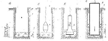 столбов фундаментов 6.81. Последовательность работ по омоноличиванию свай (столбов) по методу выдавливания устанавливается следующая (рис. 13): электронагревателями, опущенными в скважину, растапливают на ее поверхности намерзший шлам и лед; очищают поверхность сваи (столба) от льда и грунта, особенно тщательно на участках расчетной зоны заделки сваи (столба); на поверхность сваи (столба) наносят гидроизоляцию, если она предусмотрена проектом; проверяют наличие фиксаторов и рифлений (если они предусмотрены проектом) в нижней части сваи (столба); определяют влажность шлама и согласно п. 6.80 рассчитывают необходимое количество компонентов, требуемое для приготовления цементно-шламо-песчаной или цементно-шламовой растворной смеси; подают на дно скважины все составляющие, необходимые для приготовления растворной смеси. Пластифицирующие и противоморозные добавки вводят с водой затворения, подаваемой на дно скважины. Подача их в сухом виде запрещается; ударной частью бурового станка перемешивают растворную смесь. Высота подъема ударной части должна быть не менее 80 см. Время перемешивания 10 мин; если омоноличивание производят цементно-песчаным раствором, то растворную смесь приготовляют в растворосмесителе и подают на дно скважины по трубопроводу растворонасосом через хоботы или в бадьях с открывающимся дном. Высота свободного падения растворной смеси должна быть не более 1,5 м; в приготовленную или поданную на дно скважины растворную смесь опускают сваю (столб) до отметки, предусмотренной проектом, и фиксируют ее положение в плане. 6.82. Сваи (столбы) на участке от верха расчетной зоны заделки до низа деятельного слоя рекомендуется омоноличивать не позднее чем через сутки после установки сваи (столба). 6.83. Цементно-шлаково-песчаный или цементно-шламовый раствор, омоноличивающий зазор на участке от верха зоны анкеровки до низа слоя сезонного оттаивания, приготовляют в бетоно- или растворосмесителях, а также на дне одной из разбуриваемых скважин по методике, приведенной в п. 7.81, с дальнейшим извлечением ее желонкой. 6.84. В случае невозможности удаления воды из готовой обводненной скважины забой рекомендуется очистить от шлама эрлифтированием. Растворную смесь в этом случае подают на дно скважины методом ВПТ и после промывки забоя водой под давлением опускают в нее столб. Марку раствора в этом случае рекомендуется назначать не ниже М 200, а расход цемента увеличивать на 20%. 6.85. К дальнейшим работам по строительству надфундаментной части (железобетонные насадки на сваи) разрешается приступить при монолитной конструкции сразу после установки в скважину последней сваи (столба); при сборной - после достижения раствором омоноличивания в расчетной зоне заделки 50% проектной прочности. 6.86. Для контроля прочности раствора омоноличивания из растворной смеси, извлеченной со дна скважины желонкой, изготовляют 9 образцов размером 7´7´7 или 10´10´10 см. На каждый элемент сооружения должно быть не менее одной серии образцов раствора. Образцы рекомендуется содержать в помещении или в специально пробуренной скважине с температурой, соответствующей температуре грунта в зоне заделки. Через двое суток контрольные образцы распалубливают, маркируют, заворачивают в полимерную пленку и оставляют твердеть в тех же условиях до их испытания. Первое испы