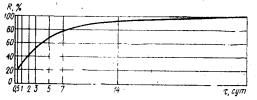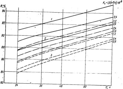 Рис. 43. График удельного изотермического тепловыделения портландцемента при твердении бетона в нормальных температурно-влажностных условиях 3. По (известному расходу цемента на 1 м3 бетона определяем выделяемое на это количество тепло. Аналогичным путем определяется нарастание прочности бетона, твердеющего при различных температурах, если имеется график нарастания прочности бетона, твердеющего в нормальных температурновлажностных условиях при 20°С. б) Пример определения нарастания относительной прочности бетона, твердеющего при различных температурах Требуется определить относительную прочность бетона, твердеющего при температуре 25°С - 10 ч, 30°С - 12 ч, 32°С - 23 ч, если известно нарастание прочности бетона при 20°С. 1. Определяем время, которое потребовалось для нарастания этой же относительной прочности, если бы температура твердения была равна 20°С: t20 = 10/0,8+ 12/0,62 + 23/0,6 = 60,1 ч. По графику, приведенному на рис. 44, находим относительную прочность бетона, оказавшуюся равной 46% R28.