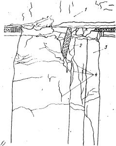 где l - длина линии, м; r - удельное электросопротивление провода, Ом×мм2/м; S - площадь сечения провода, мм2; Р и U - подводимые соответственно мощность, Вт, и напряжение, В. В качестве проводов могут быть использованы провода и кабели типов ПРД, ПР, ПВ, АПР, АПВ, ВРГ, КРПТ и др. 6.127. Автоматизация процесса электротермообработки бетона предусматривает: автоматическое регулирование температуры бетона в соответствии с заданным режимом; дистанционный контроль температуры; дистанционное управление исполнительными устройствами; автоматическую блокировку включения прогрева. 6.128. В качестве датчиков температуры следует использовать термометры сопротивления типа ТСМ или ТСП (соответственно медный и платиновый). 6.129. Регулирование температуры в бетоне может осуществляться электронными мостами типов ЭВМ и ЭМД; потенциометрами типа КСП-4; автоматическими регуляторами температур типов ПРТЭ-2М, ЭРП-61 или МРТЗ-10. При отсутствии на стройплощадке необходимых приборов по автоматическому регулированию режимов электропрогрева для контроля за температурой прогрева можно пользоваться заленивленными техническими термометрами. 6.130. При производстве работ по электротермообработке бетона должны соблюдаться требования по технике безопасности главы СНиП III-4-80 и разд. 10 настоящего Руководства. При монтаже электроустановок, кабелей и проводов необходимо руководствоваться положениями «Правил устройства электрических установок», а при эксплуатации - «Правилами эксплуатации электрических установок промышленных предприятий». Примеры бетонирования с применением электропрогрева буронабивных железобетонных свай на строительстве трассы БАМ и в Воркуте приведены в прил. 10. Ремонт свайных и столбчатых фундаментов 6.131. Работы по восстановлению фундаментов должны производиться независимо от времени года по чертежам и сметам проектной организации и под их авторским надзором. 6.132. Разрушения бетона фундаментов в продуваемых подпольях и в других случаях в основном имеют два вида: а) нарушение структуры, образование трещин в бетоне или его разрушение в пределах сезоннооттаивающего слоя грунта 1-1,5 м и выше его поверхности (в зоне капиллярного подсоса 0,2-0,5 м) под влиянием многократного замерзания в насыщенном состоянии и оттаивания - при недостаточной морозостойкости бетона (рис. 17); б) образование трещин и скалывание бетона на участках сопряжения столбчатых фундаментов и оголовков свай с ранд-балками ростверков под влиянием температурно-влажностных деформаций вследствие линейного укорочения элементов конструкции при низких отрицательных температурах наружного воздуха (рис. 18).
