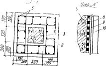 Рис. 49. Схема электропрогрева конструкций В процессе прогрева производилось измерение тока в линии и в ветви, который на всем протяжении прогрева оставался практически на одном уровне соответственно 105 и 8 А. Процесс прогрева, продолжавшийся в течение 24 ч, прекращался после достижения в бетоне температуры 55-60°С. Расход электроэнергии на 1 м3 бетона составил примерно 30 кВт. К моменту снятия напряжения с электропроводов самая высокая температура 57-60°С наблюдалась в среднем сечении фундамента (табл. 59, термопары 5,6), самая низкая 22-13°С находилась в верхней зоне (табл. 59, термопары 8, 9) фундамента. В зоне расположения электрода температура равнялась 60-62°С (табл. 59, термопары 6, 7). Несмотря на то, что температурные градиенты в верхней и нижней зонах фундамента одинаковые 0,3°С/см, средняя температура твердения в нижней, выше примерно в 2-2,5 раза. Соответственно и прочность в этой зоне следует ожидать выше. То же самое можно сказать и про среднюю зону, хотя градиент в ней выше (0,5°С/см), чем в других зонах. После окончания электропрогрева температура во всех точках фундамента стала снижаться, причем скорость остывания в различных точках не одинаковая: в верхней зоне выше, в средней - ниже, а в нижней еще ниже, хотя последняя находилась в контакте с отогретым грунтом. Если через 76 ч остывания в углах верхней зоны температура достигает 0°С, то в тех же углах нижней зоны она находится на уровне 19°С. После проведения такого режима прогрета и выдерживания бетона, продолжавшегося в течение 5,5-6 сут, установлено, что при средней температуре твердения 26°С в течение этого времени бетон приобрел прочность 75-80% R28. Аналогичны конструкции прогревались комбинированным способом, состоящим из предварительного разогрева электрическим током бетонной смеси с последующим электропрогревом бетона по периферии. Кинетика температурного поля приведена в табл. 60. Таблица 60 Кинетика температурного поля ленточного фундамента, изготовленного с применением разогретой смеси и последующим дополнительным электропрогревом