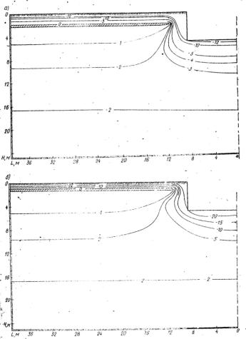 где a - коэффициент теплообмена на поверхности, Вт/(м2×град), в среднем можно принимать a = 23,2 Вт/(м2×град); Rиз - термическое сопротивление мохорастительного покрова или иной теплоизоляции на поверхности грунта, м2´град/Вт; hсн - мощность снежного покрова средняя за зимний сезон, м; lсн - коэффициент теплопроводности снежного покрова, определяемый по формуле Б.В. Проскурякова, где rсн - объемная масса снежного покрова, кг/м3; qл - скрытая теплота фазовых переходов воды, содержащейся в грунте, кДж/м3, определяемая по формуле qл = rgскwi (24) где r = 336 кДж/кг - постоянная льдообразования; gск - объемная масса скелета грунта, кг/м3; w - влажность грунта (по массе) в долях единицы; i - относительная льдистость грунта в долях единицы. 8.4. Температуру грунта на глубине нулевых годовых амплитуд рекомендуется прогнозировать расчетом на ЭВМ. 8.5. В тех случаях когда полученная по формуле (19) глубина сезонного оттаивания превышает возможную при данных условиях максимальную глубину сезонного промерзания hм и в грунте с течением времени образуется талик, рекомендуется определять его мощность через п лет. 8.6. Температура грунта вокруг вырытого котлована зависит: от температуры, формирующейся на данной глубине в естественных условиях теплообмена (не нарушенных строительством) от условий теплообмена поверхности, вырытого котлована или скважины с окружающим грунтом (среднемесячных температур воздуха в районе строительства, наличия тепловой изоляции, в том числе снега и льда на поверхности грунта, времени производства работ и др.); от способа устройства котлована или бурения скважины; от продолжительности технологических перерывов между окончанием устройства котлована (или бурения скважины) и укладкой бетона; от способа предохранения, котлована или скважины от переохлаждения; от принимаемых мероприятий по прогреву котлованов или скважин перед укладкой бетона и других. Значения температурных полей в грунте вокруг котлована без скважины (рис. 20) и со скважиной (рис. 21) в различные интервалы времени могут быть получены на основании расчетов на ЭВЛ