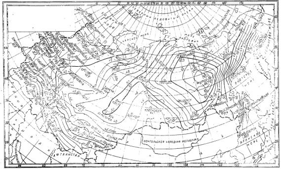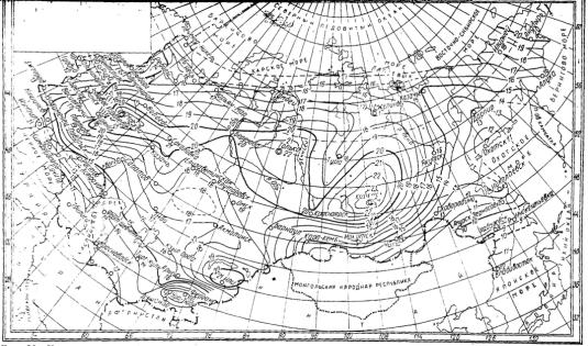 Рис. 21. Температурное поле в грунте вокруг котлована со скважиной 8.7. В ряде случаев (скальные грунты, в течение года полностью промерзшие грунты, сухие крупнообломочные и песчаные грунты можно пользоваться упрощенной методикой прогнозирования изменения температурного режима грунтов основания, приведенной пп. 8.10-8.15 и прил. 7. 8.8. Методика распространяется на крупноразмерные котлован с вертикальными стенами высотой и длиной более 8 м, горизонтальным дном длиной и шириной более 9 м и на грунты с влажность менее 2,5%, при которой можно не учитывать скрытую теплоту и изменения агрегатного состояния воды при переходе через 0°С. 8.9. Для предупреждения замораживания бетона до момента набора им требуемой прочности рекомендуется рассчитывать поля наиболее низких температур грунта, возможные в данном климатическом районе. 8.10. Расчет температурных полей в грунте котлованов производят пятью этапами, приведенными в пп. 8.11-8.15. 8.11. На первом этапе для котлована рекомендуется определить: максимальную амплитуду годового хода среднемесячных температур воздуха Аг по карте рис. 22, максимальное декадное понижение среднесуточных температур воздуха Ад от годового хода среднемесячных температур по карте рис. 23 и многолетнюю среднегодовую температуру воздуха tг.ср по табл. 1 главы СНиП II-А.6-72.