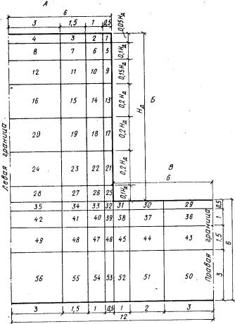 Рис. 24. Разбивка расчетной области на блоки 8.13. На третьем этапе рассчитывают температуру ti в центрах блоков № 1-56 и на поверхностях А, Б и В (см. рис. 24) по формуле где k1 - коэффициент, равный +1 для мая - октября, -1 для января - апреля и ноября - декабря; k2 - коэффициент, равный -1 для октября - декабря и января - февраля, -0,5 для марта - августа. Значения