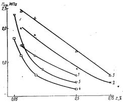 с вечномерзлым грунтом при Т = -2°С (% R28) При введении в бетон противоморозных добавок твердение бетона будет происходить при положительных и отрицательных температурах. Однако при применении таких бетонов необходимо учитывать возможность миграции из них в контактирующий вечномерзлый грунт веществ - понизителей температуры замерзания воды. Наиболее интенсивно миграция происходит на начальных этапах твердения бетона (рис. 27), когда в грунт мигрирует раствор с противоморозной добавкой. Количество веществ, перешедших из бетона в грунт, зависит от вида и количества добавки (рис. 28), состава бетона, его влажности и температуры, а также от структуры, влажности и температуры вечномерзлого грунта. Во времени соли мигрируют в толщу грунта преимущественно по вертикали вниз в слои, лежащие под подошвой фундамента. Соли могут привести к размораживанию грунта, что снизит его несущую способность (рис. 29). Кроме того, миграция солей к боковой поверхности конструкций вызывает образование жидкой пленки между поверхностью бетона и грунтом, что снижает сопротивление сдвигу по контакту бетон - мерзлый грунт (рис. 30). Миграция веществ - понизителей температуры замерзания воды в контактирующий с бетоном вечномерзлый грунт может происходить и из бетона с добавками - ускорителями твердения бетона, но в меньшей степени, так как количество таких добавок, введенных в бетонную смесь, меньше, чем противоморозных.