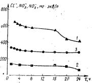 сопротивления сдвигу по боковой поверхности смерзания от засоленности грунта На выбор конкретных добавок для бетонов, укладываемых в вечномерзлый грунт, большое влияние оказывает характер взаимодействия добавок с цементом. Химические добавки, в состав которых входят соли натрия, медленно взаимодействуют с минералами цементного клинкера и в бетоне длительное время сохраняется жидкая фаза. Бетоны с такими добавками медленно набирают прочность, и из них наиболее интенсивно происходит миграция солей в контактирующий грунт. Химические добавки, содержащие кальциевые соли, активно взаимодействуют с минералами цементного клинкера, ускоряя твердение, особенно в начальный период. Соли кальция, участвуя в формировании кристаллического сростка, являются носителями прочности. Миграция солей в вечномерзлый грунт из бетонов с добавками менее интенсивна, чем из бетонов с добавками, содержащими соли натрия. Процессы изменения температуры замерзания жидкой фазы бетона с добавками на основе солей кальция и образование в нем льда суммируются из двух противоположных, одновременно протекающих процессов. С одной стороны, быстрый вывод добавки вследствие вступления ее в химическое взаимодействие с минералами цементного клинкера приводит к повышению температуры замерзания бетона, с другой - выпадение кристаллов чистого льда повышает концентрацию раствора, что способствует сохранению в бетоне жидкой фазы. Однако в бетонах с добавками на основе солей кальция первый процесс преобладает над вторым, поэтому целесообразно применять различные композиции из сочетания двух солей или более (нитрит-нитрат кальция - ННК, нитрит-нитрат-хлорид кальция - ННХК и т.д.), когда каждая составляющая вносит свой положительный вклад при формировании структуры твердения. Добавки ННХК, ННК, CaCl2-NaNO2 являются добавками полифункционального действия, которые не только снижают температуру замерзания поровой жидкости, но влияют на силикатную и на алюминатную (алюмоферритную) составляющие клинкера. Влияние на силикатную составляющую, проявляющееся в увеличении ее растворимости, ускорении гидратации, изменении морфологии и степени полимеризации гидросиликатов, в первую очередь обусловлено изменением величины рН и ионной силы жидкой фазы. Влияние на алюминатную и алюмоферритную составляющие клинкера проявляется в образовании двойных солей. Возникновение этих соединений подтверждается обнаружением их в твердой фазе и снижением концентрации составляющих ионов в жидкой фазе. Наиболее интенсивно снижается концентрация в жидкой фазе хлоридов, несколько меньше нитратов и совсем мало нитритов (рис. 31). Параллельно со снижением концентрации этих ионов в жидкой фазе происходит их накопление в твердой фазе в составе двойных солен. За сутки и зависимости от температуры в твердую фазу может переходить от 40 до 60% хлоридов. Вывод столь большого количества ионов кальция и хлоридов не компенсируется обогащением ее в ходе гидратации ионами щелочных металлов и гидроксила, поэтому температура замерзания жидкой фазы в крупных порах повышается. Однако это не приводит к серьезным отрицательным последствиям, поскольку в бетонной смеси с этими добавками формируется цементный камень плотной и тонкопористой капиллярной структуры, в которой снижается температура заме