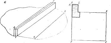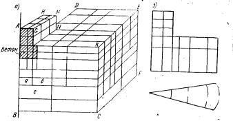 Рис. 34. Прямоугольный бетонный массив На рис. 35,а приведена бетонная стенка, возведенная на площадке. Плоскость FAC является плоскостью абсолютной тепловой изоляции. Плоскость, проходящая через прямую KR, ограничивает расчетную область справа. В связи с тем что вдоль продольной оси стенки температуру, можно считать постоянной, для анализа температурного режима расчетной области достаточно двухмерной области (рис. 35,б).