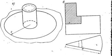 Рис. 35. Бетонная стенка Иногда трехмерное распределение температур можно рассчитать с помощью двухмерной схемы. Например, цилиндрический массив (рис. 36,а) с симметричным то радиусу распределением температуры можно рассчитать по схеме, изображенной на рис. 36,б. Для этого выделяется расчетная зона, в плане представляющая собой сектор. Радиус R определяет зону влияния бетонного массива. Боковые поверхности сектора представляют собой поверхности абсолютной тепловой изоляции. Часто для исследования достаточно рассмотреть одномерную схему распространения тепловых потоков.