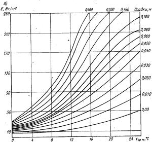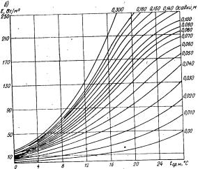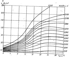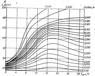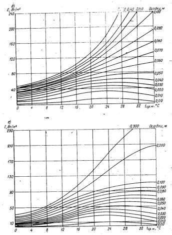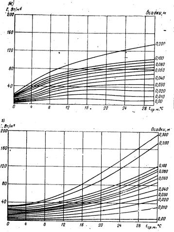 где Е - среднемесячная величина затрат тепла на суммарное испарение воды с 1 м2 поверхности грунта, Вт/м2. Значения Е принимаются из номограмм рис. 39 в зависимости от среднемесячных значений температуры воздуха и осадков и относятся к поверхностям, покрытым травяной растительностью в естественных условиях увлажнения. При других типах поверхностен значения DtE, вычисляемые по формуле (55), должны корректироваться путем умножения на коэффициент Ке, учитывающий влияние физических свойств поверхности и глубины залегания грунтовых вод.