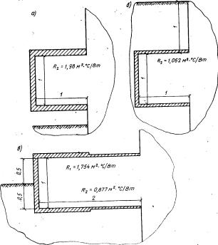 Рис. 40. Температурное поле в грунте котлована глубиной 12,5 м Коэффициент теплопроводности снега по формуле (23) равен: lсн = 0,21 Вт/(м×К). Толщина грунта эквивалентная снегу по термическому сопротивлению, равна: lэк = 2,1×0,15/0,21 = 1,5 м. При lэк = 15 тепловое влияние снега следует учитывать через 6 сут (см. п. 8.15 настоящего Руководства); фактически снег лежал дольше 10 сут, поэтому за искомое температурное поле дна котлована считаем условно то, которое будет ниже заштрихованной части (см. рис. 40). Из рис. 40 видно, что к моменту бетонирования сооружения грунт будет иметь положительную температуру на дне котлована и отрицательную (до –21°С) в стене котлована. ПРИЛОЖЕНИЕ 8определение термического сопротивления теплоизоляции rm для выступающих частей конструкции1. Для определения величины Rm рекомендуется установить особенности воздействия внешней среды на наружные поверхности выступов (рис. 41). В практике возможно три вида такого воздействия: первый - вся площадь наружных поверхностей подвергается воздействию температуры холодного воздуха; второй - то же, мерзлого грунта; третий - тоже, частично холодного воздуха и мерзлого грунта.