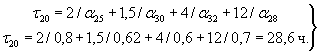В табл. 58 приведены значения переходных коэффициентов a для различных температур (через 10°) при тепловлажностной обработке и нормальных условиях твердения бетона. Примеры пользования переходными коэффициентами, а) Пример определения тепловыделения портландцемента, твердеющего при различных температурах Требуется определить тепловыделение 1 кг портландцемента, твердеющего при температуре 25°С - 2 ч, 30°С - 11,5 ч, 32°С - 4 ч, 28°С - 12 ч, если известно изотермическое тепловыделение при 20°С. 1. Определяем время, которое потребовалось для выделения этого количества тепла, если бы температура твердеющего цемента: