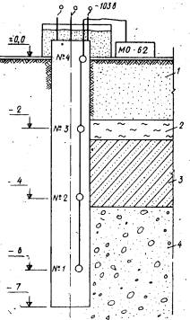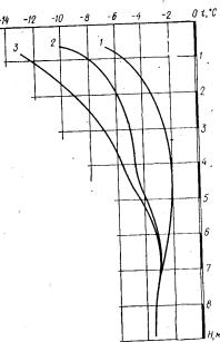 Рис. 44. График нарастания прочности, % R28, бетона марок М 200 - М 300 на портландцементе марки М 400 при температуре 20°С ПРИЛОЖЕНИЕ 10ПРИМЕРЫ ОПЫТНОГО БЕТОНИРОВАНИЯ БУРОНАБИВНЫХ ЖЕЛЕЗОБЕТОННЫХ СВАЙ НА СТРОИТЕЛЬСТВЕ ТРАССЫ БАМ И В ВОРКУТЕПример 1. Опытное бетонирование буронабивных железобетонных свай диаметрам 1000 мм и длиной 7 м было осуществлено на трассе БАМ, основная часть которой проходит по районам распространения вечномерзлых грунтов с наличием островной и высокотемпературной вечной мерзлоты. Устройство скважин производилось станками ударно-канатного бурения БС-1М в сентябре-октябре с последующей консервацией скважин при частичной обсадке стальными трубами в верхней части и закрытием устья скважины деревянными щитами. Произведенное в декабре повторное бурение показало наличие в скважинах надмерзлотной воды до отметки -3,5 м и льда толщиной 40-50 см над водой и 10-15 см по стенкам скважины. Вследствие заполнения скважины водой с октября по декабрь температурное состояние грунта стеной существенно не изменилось на глубине более 3 м, в верхней же части скважины произошло понижение температуры в среднем на 5°С. Помимо этого, из-за отсутствия снежного покрова на отсыпанной гравием строительной площадке температура в активной зоне грунта снизилась по сравнению с температурой грунта в природном состоянии (рис. 45).