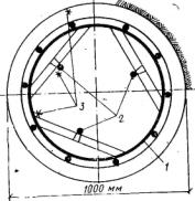 Рис. 46. Поперечное сечение буронабивной сваи Температура укладываемого бетона равнялась 8-18°С. Бетон марки М 300 применялся без химических добавок следующего состава Ц : П : Щ = 1 : 1,9 : 2,2 с расходом портландцемента марки М400, М500, кг/м3, В/Ц = 0,5 и ОК = 8-12 см. Электропрогрев осуществлялся по всей высоте сваи переменным трехфазным таком промышленной частоты при напряжении 103 В от трансформатора типа ТМОБ-63. Электропрогрев включался сразу после укладки первой порции бетона с кратковременным отключением для завершения укладки бетона, оформления оголовка сваи и его теплоизоляции. Замеры температур бетона производились электротермометрами сопротивления с мостом постоянного тока типа МО-62. Гирлянды температурных датчиков помещались в стальные трубы диаметром 50 мм и длиной 7-7,5 м с заглушённым нижним торцом, которые устанавливались в различных местах сваи (рис. 47). Средние значения температурного режима прогрева бетона в различных местах сваи приведены на рис. 48.