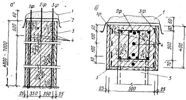 Рис. 19. Усиление сваи железобетонной обоймой 6.139. При восстановлении столбчатых фундаментов рекомендуется применять бетон марки М 200 и Мрз 200, а свайных фундаментов бетон марки М 300 и Мрз 300, приготовляемый на сульфатостойком цементе с С3А не более 6% с введением химических добавок (воздухововлекающих противоморозных, пластифицирующих) . 6.140. При укладке бетона в обойму рекомендуется соблюдать следующие условия: а) зимой температура бетонной смеси при укладке в опалубку должна быть не ниже 10°С. При температуре наружного воздуха ниже -30°С укладка бетона не допускается; б) непосредственно перед началом бетонирования бетонное основание, на которое опирается обойма, следует прогреть горячим воздухом до его оттаивания; в) бетонную смесь укладывать с тщательным виброуплотнением и не допускать перерывов в укладке не более 1 ч; г) в летнее время бетонную смесь к фундаментам, расположенным по средним осям здания, подавать пневмоукладчиками или передвижными транспортерами; д) от каждых 10 м3 укладываемого бетона отбирать по три контрольных куба. 6.140. Электропрогрев бетона рекомендуется производить непосредственно после его укладки и продолжать до набора им прочности не менее 70% R28 (в зоне минимальных температур бетона) с последующим остыванием до 10°С в опалубке. Температура электропрогрева не должна превышать 60°С. Температурный контроль должен вестись по специальным скважинам; заглубленным в бетон не менее чем на 10 см с заполнением журнала электропрогрева по установленной форме. Журнал электропрогрева заверяется производителем работ и предъявляется комиссии при сдаче работ по ремонту фундамента. Температурные скважины после распалубки, рекомендуется тщательно замоноличивать цементно-песчаным раствором. 6.142. При усилении свай стальными обоймами на сваю в зоне ее усиления наносится цементно-песчаный раствор марки М 250, приготовляемый на сульфатостойком цементе и речном песке с введением воздухововлекающих добавок и добавок-ускорителей твердения. При разрушении бетона сваи на глубину ее 4-5 см цементно-песчаный раствор наносится в несколько приемов. На свае после нанесения на нее раствора монтируется с вживанием в раствор посредством струбцин стальной каркас обоймы, предусмотренный проектом. При этом обойма должна перекрывать зону подверженного разрушению бетона сваи не менее чем на 1 м. Все электросварочные работы по монтажу обоймы рекомендуется производить в соответствии с проектом дипломированным сварщиком. 6.143. Гидроизоляцию бетона обойм рекомендуется производить за два раза непосредственно после снятия опалубки по теплому бетону. 6.144. Обратная засыпка восстановленных фундаментов производится после приемки их технической инспекцией. В зимнее время обратная засыпка производится послойно (по 0,3 м) талым песком или местным мерзлым естественным грунтом (не содержащим шлака и щебня) с уплотнением пиевмотрамбовками. Летом обратная засыпка производится местным естественным грунтом с послойной трамбовкой. В обоих случаях обратная засыпка с учетом ее последующей осадки должна превышать планировочную отметку подполья на 0,5 м. Допускается обратную засыпку фундаментов, восстановленных в зимнее время и находящихся в условиях, исключающих проникание в них поверхностных и аварийных вод, производить летом до 15 июля талым грун
