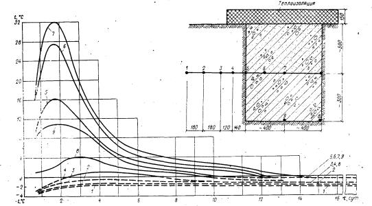 Рис. 54. Температурный режим остывания бетона в свае-модели