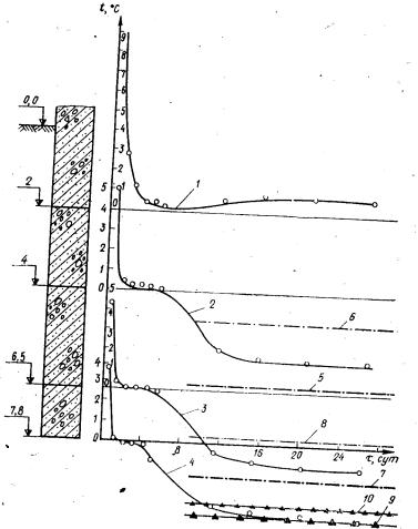 Рис. 51. Схема расположения термопар и температурный режим остывания бетона в свае-модели диаметром 800 мм (точки и кривые 5-9) и прилегающего вечномерзлого грунта (точки и кривые 1-4) Таблица 61 Прочность бетона к моменту замерзания