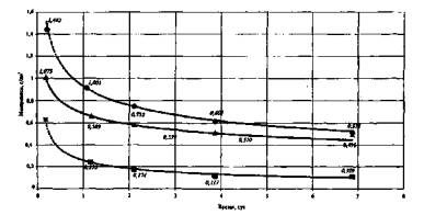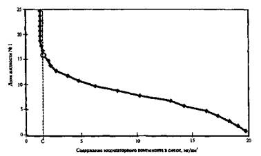 Рисунок 8.2 - График смешения жидкостей 8.1.2.5 Образовавшиеся осадки собирают, взвешивают и анализируют. 8.1.3 Определение совместимости в системе "жидкость-порода". 8.1.3.1 Емкость 1 плотно набивают керновым материалом поглощающего горизонта; если керн монолитный, то его предварительно помещают в плотно облекающую резиновую оболочку. Заполненную породой емкость взвешивают с точностью до миллиграммов, при этом добиваются чтобы пористость образца была близкой к пористости породы. 8.1.3.2 Если температура поглощающего горизонта отличается от температуры помещения, где проводится эксперимент более чем на 15 °С, то с помощью терморубашки 9 ее можно довести до соответствующего значения. 8.1.3.3 Закрывают емкость 1 крышкой 2, вентиль 4 закрыт. 8.1.3.4 Наливают в емкость 5 первой установки жидкость и, приподнимая-опуская емкость 5, вытесняют из трубки 6 воздух (прекращение выделения пузырьков). 8.1.3.5 Устанавливают емкость 5 на высоту 2-2,3 м от основания. 8.1.3.6 Открывают вентиль 4 и заполняют емкость 1 до полного насыщения породы. В журнале фиксируют моменты открытия вентиля 4 (пуск), появления первой капли жидкости в стакане 8, время полного насыщения керна и момент закрытия вентиля 4 (остановка). 8.1.3.7 По градуированной шкале емкости 14 замеряют объем израсходованной жидкости, V. 8.1.3.8 В таком положении установку оставляют на сутки. 8.1.3.9 Через сутки по контрольной емкости определяют объем воды, испарившейся за прошедшее время, и делают соответствующие корректировки. 8.1.3.10 Открывают вентиль 4 и в емкость 8 сливают объем жидкости V, после чего вентиль 4 закрывают. 8.1.3.11 Фиксируют время начала и окончания истечения объема V жидкости, атмосферное давление, комнатную температуру и объем испарившейся воды по показаниям контрольной емкости. Гидростатическое давление истечения жидкости из емкости 14, hг мм.в.ст., определяется по формуле: hг = h·γв, (5) где h - расстояние от уровня жидкости в емкости 5 до дна емкости 1, мм; γв - удельный вес, доли ед. По градуированной шкале емкости 1 замеряют приращение объема породы при контакте с водой. 8.1.4 Рассчитывают проницаемость породы. 8.1.5 Количественную оценку негативного воздействия несовместимости в системе "жидкость-порода" на фильтрационные свойства поглощающего горизонта находят решением следующих операций [36]. 8.1.5.1 Объем породы, содержащий 1 дм3 пластовой воды Vп, дм3, рассчитывают по формуле