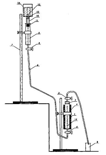 8.1.6 Расчет влияния осадков железа на фильтрационные свойства породы проводится аналогичным способом с учетом, что 1 г двухвалентного железа Fe2+ при переходе в Fe3+ образует 5 см3 осадка. 8.1.7 Влияние разбухания глинистых минералов на фильтрационные свойства коллектора в термобарических условиях пласта определяют на установке, изображенной на рисунке 8.1. 8.1.8 По результатам определения проницаемости рассчитывается
