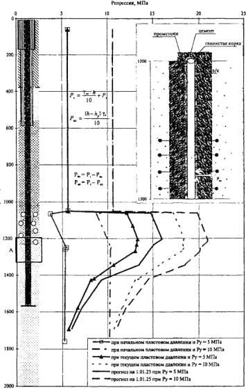 Гидравлические потери в трубопроводе определяют по разности показаний образцовых манометров на его входе и выходе. При закачке в межтрубное пространство гидравлические потери снижаются во много (до десятков) раз, поэтому при необходимости закачки жидких отходов производства свыше 500 м3/сут следует рассмотреть возможность использования для нагнетательных скважин 127-мм или 168-мм обсадные колонны и проводить закачку в межтрубное пространство. Они позволяют проводить закачку с более высоким устьевым давлением при минимальных потерях энергии. 13 Контроль за состоянием нагнетательных скважин13.1 В условиях СПЗЖ постоянно возрастающая репрессия на поглощающий горизонт (как, например, это показано на рисунке 13.1) может привести к смятию эксплуатационной колонны и разрушению заколонного цемента на большую высоту от нижних дыр перфорации.