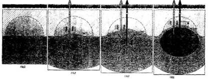 Рисунок 15.1 - Принципиальная схема развития депрессионной воронки и подземного растекания жидких отходов производства Согласно документу [38] при расчетах следует использовать коэффициент надежности (b), который для терригенных коллекторов принимается равным 1,5 (полуторакратное увеличение Vж), а для карбонатных - 3,0. Способ расчета Ra поясняет таблица 15.1 (исходные данные) и рисунок 15.2 для Уренгойского полигона (участок УКПТ), для которого Кв = 0,8, а Кох.пр. = 0,55. 15.3 В условиях отсутствия гидравлической связи между поглощающим горизонтом и залежью УВ в поглощающем горизонте при закачке происходит повышение давления (ΔР, кгс/см2), которое определяют по формуле