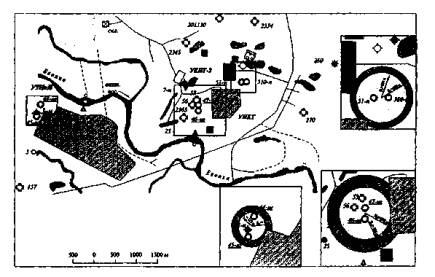 Рисунок А.1 - Уренгойское НГКМ. Зоны возможного замерзания пластовой воды (К1а-К2с) в пьезометрических и нагнетательных скважинах В скважины, уровень в которых находится выше 530 м, необходимо доливать конденсат. Расчет требующегося количества конденсата проводится следующим образом. Определяется высота водного столба ΔНвод., м, от текущего уровня Нвод. м, до глубины 530 м: ΔНвод. = 530 - Нвод (1) В случае, когда скважина заполнена технической жидкостью, по глубинному замеру давления Рсер.и/п, кгс/см2, следует рассчитать уровень пластовой воды Нвод, м, по формуле Нвод. = hсер.и/п - 10·Рсер.и/п/Yвод, (2) где hсер.и/п - глубина середины интервала перфорации, м; Yвод - плотность пластовой воды, г/см3. Затем рассчитывается эквивалентный столб конденсата (плотностью 0,8 г/см3) по формуле Δнконд = ΔНвод·0,8. (3) Объем конденсата определяется по формуле V = Δнконд·S, (4) где S - площадь полезного сечения скважины, м3. Если столб конденсата Δнконд не превышает устья скважины, то этот объем конденсата заливается в скважину. Глубина уровня, до которого необходимо долить конденсат, рассчитывается по формуле нконд. = Нвод. - (Δнконд. - ΔНвод.). (5) В противном случае следует пересчитать превышение эквивалентного столба конденсата над устьем в давление. Результаты расчетов приведены в таблице А.1. Со временем при дальнейшем снижении уровней в зону положительных температур количество скважин, в которые следует добавлять конденсат, будет сокращаться. Таблица А.1 - Уренгойское НГКМ. Расчет объема конденсата, необходимого для предотвращения замерзания пластовой воды в пьезометрических и нагнетательных (простаивающих) скважинах