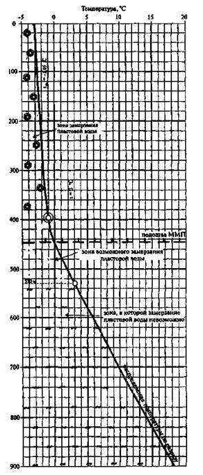 19.5 Механизм оплаты за загрязнение окружающей среды на специализированных полигонах захоронения жидких отходов производства в нормативном и правовом отношении разработан слабо. В соответствии с [38] плата за закачку жидких отходов производства в поглощающий горизонт, имеющий гидравлическую связь с залежью, не взимается. В остальных случаях взимается плата с коэффициентом 0,3 [31, 32]. 19.6 В целях стимулирования организаций к более активному осуществлению природоохранных программ платежи за загрязнение окружающей среды могут быть уменьшены на величину средств, израсходованных организацией на природоохранную деятельность. При закачке в глубокие горизонты всех жидких отходов производства согласно действующему законодательству такого вида платежи будут сокращены до минимума. Приложение А (справочное)Расчет количества конденсата, требующегося для консервации пьезометрических и нагнетательных (простаивающих) скважин на примере Уренгойского НГКМ(см. 16.2 настоящего стандарта) Наличие толщи ММП обусловливает распространение отрицательных температур до глубины 320-420 м. Для предотвращения замерзания воды требуется долив незамерзающей жидкости, чтобы столб этой жидкости перекрыл интервал низких температур, оттеснив уровень пластовой воды в более глубокую и, следовательно, в более теплую зону. Температура замерзания пластовой воды апт-сеноманского водоносного комплекса составляет минус 1,05 °С. Диапазон глубин, на которых может находиться граница зоны с температурой минус 1,05 °С, велик. Чтобы сделать расчеты более надежными, предлагается определять опасную для замерзания воды зону по термограммам скважин с наиболее глубоким распространением мерзлых пород. Температуры от минус 1,05 °С до плюс 3 °С при определенных условиях могут быть благоприятными для образования твердой фазы. Поэтому для расчетов взята безопасная для замерзания пластовой воды глубина 530 м, как это показано на рисунке А.1.