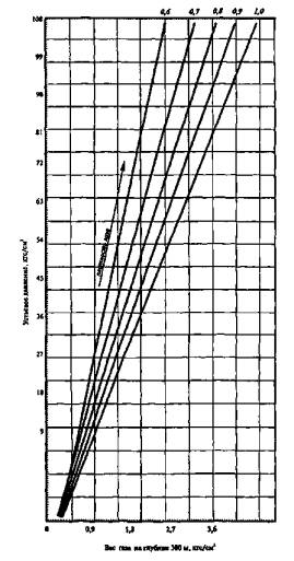 а общее давление у газлифтного клапана будет равно 50 + 22,5 = 72,5 кгс/см2. Для предварительной оценки устьевого давления и расхода газа исходят из того, что в среднем на подъем пресной воды с глубины 300 м устьевое давление должно быть не меньше 10 кгс/см2, а расход газа на подъем с этой глубины 1 м3 пресной воды составляет 6 м3. Таким образом, для подъема воды на поверхность с глубины 1500 м устьевое давление должно быть не ниже