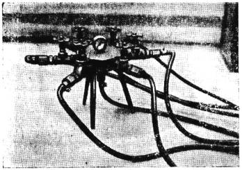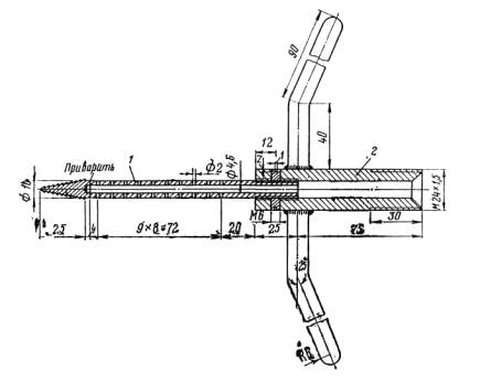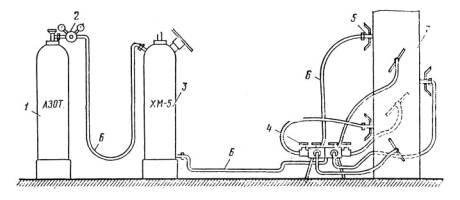 25. Партией считают любое количество медного купороса, отправляемое в один адрес и сопровождаемое одним документом о качестве. 26. Медный купорос упаковывают в деревянные бочки (ГОСТ 8777-58), фанерные барабаны (ГОСТ 9338-60), ящики весом 50-120 кг, двойные мешки (внутренний - полиэтиленовый, наружный - джутовый) или в четырехслойные непропитанные бумажные (или из двунитки) весом 35-50 кг. В ящиках и бочках делается внутренний бумажный или полиэтиленовый вкладыш, бочки стягиваются железными обручами. 27. На каждой таре несмываемой краской наносят название и сорт продукции; номер партии; вес брутто и нетто; номер стандарта. Можно наклеивать этикетки для прикрепления бирки с теми же обозначениями на тару с купоросом, поставляемым для промышленности. 28. Каждая партия должна сопровождаться документом, подтверждающим качество медного купороса и соответствие его требованиям стандарта. Документ должен также содержать: наименование продукции и сорт; номер партии и количество мест в партии; вес нетто; результаты анализа; дату отгрузки; номер стандарта. 29. Гарантированный срок хранения медного купороса в сухом неотапливаемом помещении не ограничен. 30. Тару из-под медного купороса не рекомендуется использовать для других целей. ПРИЕМКА АНТИСЕПТИКОВ31. Приемка технического бихромата натрия и медного купороса начинается с осмотра и проверки их внешнего вида. Прежде всего, следует проверить исправность тары, ярлыков, трафаретов и других надписей на таре (наименование завода и продукта, его сорт, вес и т. д.), проверить надлежащую сухость и вес материалов. К приемке не допускаются материалы, загрязненные или доставленные в ненадлежащей упаковке. Одновременно проверяют сопроводительные документы (накладные) и выясняют наличие при них заводских паспортов и анализов. 32. При отсутствии паспортных сведений в сомнительных случаях следует производить простейшие проверки материалов в отношении полноты их растворимости, отсутствия посторонних примесей, однородности состава и других показателей. В особо сомнительных случаях следует проводить качественные и количественные анализы основного химического продукта в химической лаборатории. III. УСТАНОВКА ДЛЯ МЕСТНОЙ ГЛУБОКОЙ ПРОПИТКИ ПОД ДАВЛЕНИЕМ33. Для производства местной глубокой пропитки деревянных элементов мостов водорастворимыми антисептиками используют специальную установку (приложение 1). 34. Собирается установка в следующем порядке: а) монтируют резиновые шланги, которые соединяют в единую систему: баллон сжатого воздуха, баллон антисептирующего состава, распределительная коробка и инъекторы; б) заполняют резервуар антисептирующим раствором; в) ввинчивают инъекторы в предварительно просверленные в элементах отверстия таким образом, чтобы резиновые прокладки, надетые на инъекторы около ручек, плотно прижались к древесине и закрыли отверстие, препятствуя вытеканию антисептирующего раствора через неплотности между инъектором и древесиной; отверстия делают на 2 мм меньше наружного диаметра инъектора; г) инъекторы соединяют со шлангами, идущими к распределительной коробке, при этом накидные гайки должны быть завернуты от руки без затяжки гаечным ключом. После подачи первой ступени давления воздух, находящийся в шлангах и внутри распределительной коробки, должен найти выход из всей системы ч