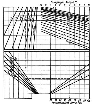 Номограмма по определению максимально допустимого времени процесса уплотнения слоя асфальтобетонной смеси: v - скорость ветра; H - толщина покрытия; Тсм - температура слоя смеси после раскладки; 1 – «холодное» - цементо- или железобетонное основание; 2 – «нейтральное» - асфальтобетонное или дискретное (щебеночное, гравийное и т.п.) основание; 3 – «теплое» - с использованием пористых материалов основание