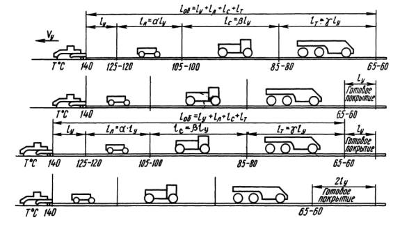 Следует иметь в виду, что указанное количество проходов относится к тандемным (колесная формула 2 × 2, две оси на два вальца) или триплексным каткам (колесная формула 3 × 3, три оси на три вальца). Гладковальцовые самоходные катки с колесной формулой 2 × 3 (двухосные трехвальцовые типа ДУ-50, ДУ-48 и др.) хотя и позволяют несколько увеличить ширину уплотнения (до 1,8 м), но должны совершать в 1,5-2 раза больше проходов по одному следу. Поэтому они менее пригодны для использования в холодную погоду. При уплотнении вибрационным или комбинированным катком (ему требуется не более 3-5 проходов) общее количество проходов можно уменьшить до 14-16, а укладчиком с эффективно работающими уплотняющими органами - до 10-14. 5.9. В состав отряда машин должен входить каток на пневматических шинах, который можно использовать для предварительного уплотнения смеси (давление воздуха в шинах 0,25-0,3 МПа при минимальной балластной нагрузке) или для основного уплотнения (давление воздуха в шинах 0,5-0,7 МПа при полной балластной нагрузке). После прохода такого катка необходимо сразу включать в работу гладковальцовый каток. Аналогичным образом при доуплотнении смеси может быть применен вибрационный или комбинированный каток (без вибрации), если конструктивный показатель силового воздействия его вальцов близок к соответствующему показателю легких катков. Этот же каток затем можно использовать на основной стадии укатки, но в вибрационном режиме. 5.10. Рабочую скорость каждого катка рекомендуется выбирать такой, чтобы за время остывания смеси в заданном интервале температур (см. табл. 8) он успел бы ее уплотнить на всей площади выбранной захватки требуемым количеством проходов. Обычно скорость статических катков составляет от 2-3 до 5,5-6,5 км/ч, вибрационных и комбинированных - до 3-3,5 км/ч, пневмоколесных - 5-10 км/ч. При этом, чем быстрее остывает смесь, тем выше должна быть рабочая скорость катка. 5.11. Качество укладки покрытия из горячего асфальтобетона в неблагоприятных погодных условиях можно обеспечить, если предварительно установить и взаимоувязать время работы каждой машины на отведенном участке (захватке), длину захватки, скорость перемещения, количество проходов катков по одному следу и т.п. Кроме того, должен соблюдаться принцип непрерывности выполняемых операций при движении отряда вперед со скоростью асфальтоукладчика; катки должны работать по челночной схеме с обязательным чередованием после завершения необходимого числа проходов по одному следу. В итоге за отрядом остается участок полностью укатанного и готового покрытия длиной lу (рис. 3). Эти принципы и условия будут соблюдены и реализованы только в том случае, если легкий, средний или тяжелый катки будут иметь строго определенную длину участка (захватку) lл, lc или lт, причем каждая из этих захваток должна содержать целое число (α, β, γ = 1, 2, 3, 4 ...) отрезков покрытия lу, проходимых укладчиком за время, равное времени остывания смеси от момента ее укладки в покрытие до начала укатки легким катком (обычно это время при толщине слоя смеси около 4 см составляет 5-6 мин в летних условиях и 2-3 мин при температурах воздуха от минус 5 до минус 7°С). 5.12. Общую длину участка (захватки) lоб работы всего отряда машин определяем по формуле lоб = vуtоб, (1) где vy - средняя рабочая скорость укладчика, м/мин; tоб - время остывания смеси от начала е