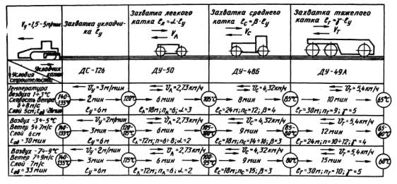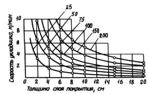 Рис. 4. Зависимость максимальной скорости асфальтоукладчика от толщины слоя при ширине раскладки 3,5 м и количества поступающей смеси, т/ч (цифры на кривых) По условию разгона и торможения длину рабочей захватки легкого, среднего и тяжелого катков рекомендуется принимать не менее 3-3,5 длины самого катка. Обычно отечественные и зарубежные катки имеют длину от 3,5 до 7 м, поэтому захватку не следует назначать менее 12-15 м (легкого катка), 18-22 м (среднего) и 25-28 м (тяжелого). Таким образом, с учетом захватки укладчика Ly минимальную общую длину захватки всего отряда машин рекомендуется принимать не менее 60-65 м. В благоприятных погодных условиях (лето) рациональная длина общей захватки составит 130-150 м. 5.13. Общий участок рекомендуется разбивать на ряд захваток для работы каждой машины: lоб = lу + lл+lc + lт = lу (1+α+β+γ). (2) Длину этих захваток принимают пропорциональной периодам работы каждой машины с учетом остывания смеси, причем в сумме эти периоды не должны превышать общего времени укладки и уплотнения смеси: lоб = vуtоб = vу(tу + tл + tc + tт) = vуtу(1+α+β+γ). (3) Независимо от толщины слоя смеси и погодных условий общее время работы укладчика и катков, найденное по номограмме рис. 1 или по табл. 5, рекомендуется распределять следующим образом: укладчик - 5-10 %, легкий каток - 10-20 %, средний каток - 25-30 %, тяжелый каток - 40-50 %, т.е. в среднем можно принимать такое соотношение: tоб/tу = l + α + β + γ = 1 + (2 ÷ 3) + (2 ÷ 4) + (4 ÷ 6) = 9 ÷ 14. Пример распределения общего времени между отдельными машинами с расчетом других основных параметров технологии и схематическим ее изображением приведены в прил. 4. 5.14. Длину захватки любого катка рекомендуется определять по формуле