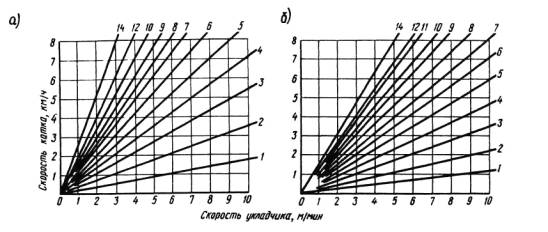 Рис. 5 Зависимость скоростей асфальтоукладчика и катков при вк = 3 м (а) и вк = 2 м (б) при различном количестве проходов по одному следу (цифры на кривых) Таблица 9