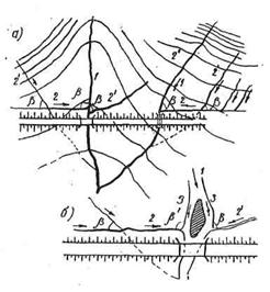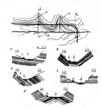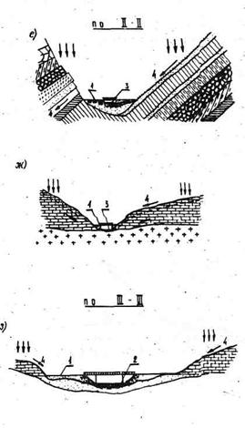 *L - длина бассейна; В - ширина бассейна; ic - уклон склонов; iд - уклон лога, Примечание. Коэффициент опорожнения для квадратной формы бассейна принят за единицу Если горизонт межени снижается уже после образования ледяного покрова, то это свидетельствует о потерях руслового стока на наледеобразование в верховьях 22. Степень обводненности бассейна, пересекаемого водотоком, так же как и скорость сброса запасов воды, в значительной степени определяется петрографическим составом подстилающих почву пород и наклоном пластов. Скала изверженных или осадочных пород, содержащих частицы кварца, со временем "обрастает" с поверхности рыхлым фильтрующим слоем дресвы или песка, который обеспечивает замедленный и рассредоточенный подземный сток жидких осадков. Такой замедленной водоотдачи совсем не происходит на участках, сложенных карбонатными породами. При их наличии жидкие осадки либо быстро (еще до наступления морозов) скатываются по поверхности в понижения рельефа, либо, просочившись по трещинам до водоупорного слоя, создают сосредоточенные подземные потоки с быстро уменьшающимся во времени расходом. Сток на участках, сложенных карбонатными породами, часто прекращается уже к наступлению первых сильных морозов, в связи с чем в этих условиях редко наблюдаются интенсивные неравномерные скопления льда на водотоках и в грунтах. Исключение представляют участки, где толща пород, особенно на контакте карбонатных с изверженными, нарушена тектоническими трещинами и разломами, по которым на поверхность иногда поднимаются глубинные воды. Четко выраженная связь между скоростью водоотдачи и составом горных пород может быть прослежена лишь при учете одновременно характера напластования и наклона слоев (рис. 1). 23. Возникновение наледей на участке перехода через водотоки после окончания строительства дороги тем вероятнее, чем больше ожидается на этом участке инженерных наледеобразующих факторов, чем больше потенциальных (природных) факторов наледеобразования и чем продолжительнее поступление воды с бассейна при прочих равных условиях. Исходные предпосылки к прогнозу наледей на переходах через водотоки 24. Любое препятствие на пути замерзающего водного потока - мерзлотный барьер, каменистый перекат , скопление шуги, снежные массы, сброшенные на неокрепший ледяной покров, и т.п. могут рассматриваться, как гидравлические местные сопротивления и оцениваться по формуле: Рис. 1.Примеры учета дислокаций земной коры при оценке
