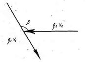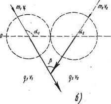 где DТ= Т0 - Т погашенная кинетическая энергия до соударения; Т0 кинетическая энергия до соударения; Т суммарная кинетическая энергия объединившихся потоков. В частном случае, когда a2 = 0. угол соударения β = a1 (рис. 2, б). При неупругом прямом центральном ударе*, когда a1 =180° и a2 = 0, уравнение (1) превращается в известную формулу Карно: