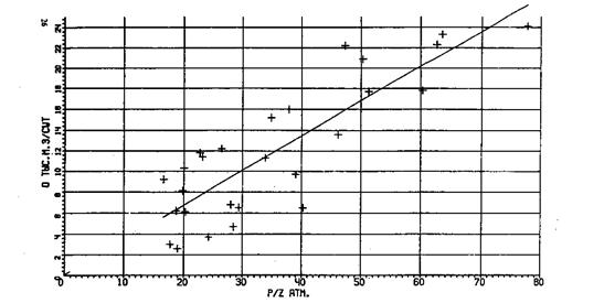 где СР - коэффициент утечки газа; РG - максимальное давление газа в хранилище; Рo - начальное давление в хранилище; n - показатель степени (в зависимости от конкретных условий). Применение этих уравнений на практике при наличии утечек газа из подземного хранилища связано с трудностями в определении параметров γ, СР, h; в ряде случаев мы не можем физически измерить дебит перетока или давление газа в контрольном месте и проверить в каждом конкретном случае правильность этих выражений. Рассмострим определение функциональной зависимости дебита перетекающего газа на одном из подземном хранилищ газа, созданном в водоносном пласте. Эксплуатация этого хранилища была осложнена перетоками газа из объекта хранения в контрольные горизонты, в результате чего сложилась аварийная ситуация. Проводимая разгрузка перетекающего газа из контрольных горизонтов обеспечила безопасную работу ПХГ. На протяжении ряда лет проводились замеры перетекающего газа при разгрузке. Схема перетока газа на данном хранилище представляет собой следующее: газ из объекта хранения через негерметичность в покрышке попадает в контрольные горизонты, образует газовый пузырь, который с течением времени расширяется. Затем газ попадает в близлежащие разгрузочные скважины и затем выпускается в атмосферу. В данной ситуации замерить давление газа в контрольном горизонте не представлялось возможным, т.к. перетекающий газ при появлении в контрольной скважине сразу стравливался в атмосферу, поэтому была поставлена задача исследования функциональной зависимости величины перетекающего газа от пластового давления. Для этого были обработаны результаты наблюдений дебита разгружаемого газа от пластового давления в хранилище с 1982 по 1992 год, которые представлены графически (рис 1). Корреляционный анализ экспериментальных данных показал, что взаимосвязь параметров давления расхода перетекающего газа наблюдается в определенные периоды эксплуатации ПХГ, это соответствует изложенной схеме перетоков газа на этом хранилище. Проведенный корреляционный анализ позволил сделать следующие выводы: 1) Объем перетекающего газа из объекта хранения в контрольные горизонты в основном пропорционален величине пластового давления в хранилище (P/Z). 2) Утечки газа при эксплуатации носят непрерывный характер. 3) Нарушение корреляции дебита разгружаемого газа происходит в связи с образованием газового пузыря в контрольном горизонте при нарушении соотношения qразг = qnep, т.е. на данном хранилище в определенные моменты эксплуатации количество перетекающего газа превосходит количество отбираемого при разгрузке.