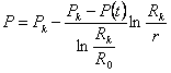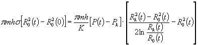 Анализ результатов таблицы показывает: - годовой расчетный объем перетока газа с 1990 по 1992 гг. практически постоянен и составляет 6-7 млн. м3; - фактический отбор газа при разгрузке перетекающего газа увеличивался с 1989 по 1991 гг. с 3987 тыс. м3 до 5215 тыс. м3 соответственно. В 1991 г. отмечено значительное увеличение фактического отбора газа (5215 тыс. м3), что, учитывая точность измерений, существенно приблизилось к расчетной величине перетока газа (6715 тыс. м3). 5.2.2. Метод последовательной смены стационарных состоянийОбозначим абсолютное давление газа в хранилище через р(t)=p, радиус хранилища (радиус равновеликого газового цилиндра ) через R0(t), объем газа в хранилище, отнесенный к нормальным условиям, через Vн(t). Следуя расчетной схеме МПСС, будем считать, что за время t воронка депрессии распространилась на некоторую условную длину RK(t), за пределами которой остается первоначальное пластовое давление р, причем в кольце R0(t)<r<RK(t) распределение давления следует закону Дюпюи: