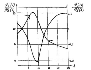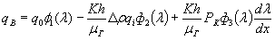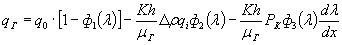Значения функции ф1(λ), ф2(λ), ф3(λ), ф4(λ), для условий хранилища (К = 2,5 Дарси, m = 0,2; h = 10 м; μB =1 сПз; μГ = 0,018 сПз приведены на рис. 3,4. Угол наклона пласта к горизонтальной плоскости примем равным i = 0,005. Под qo принимается суммарный объем расхода жидкости и газа, приходящийся на единицу длины. Обратим внимание, что в этом случае пласт имеет подъем, в связи с чем перед вторым слагаемым в выражении стоит знак минус. Дебит газа, очевидно, будет равен: