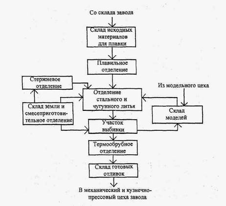 Рис. 1.2. Схема технологического процесса литейного цеха 1.1.2. Кузнечно-прессовый цехЦех предназначен для производства деталей и заготовок из слитков или проката черных металлов методом свободной ковки на молотах и прессах. Производительность цеха - 6 тыс. т поковок в год. Максимальный вес поковок достигает 3 т. Состав цеха и характеристика его отделений и участков приведены в табл. 1.1, а схема технологических потоков - на рис. 1.3.