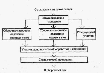 1.1.5. Цех металлоконструкцийЦех предназначен для изготовления деталей и узлов изделий, имеющих неразъемные соединения, выполненные преимущественно сваркой. Основным исходным материалом для производства металлоконструкция служит прокат металлов. Могут выполняться комбинированные конструкции из поковок, отливок, проката. Технологические операции обслуживаются самоходными безрельсовыми тележками, а также мостовыми кранами. После сварки изделия могут проходить комплекс дополнительной обработки: механическую и термическую обработки травления, гидравлические испытания и окраску. Передача металлоконструкций на соответствующие участки производится тележками и мостовыми кранами. Готовые изделия поступают на цеховой склад готовой продукции и далее в сборочный цех. Схема технологического процесса в цехе приведена на рис. 1.5.