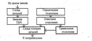 1.1.6. Термический цехЦех предназначен для обработки чистовых деталей после механической обработки, а также сварных узлов и прокатных валков. Детали, поступившие в цех, размещаются на складе в соответствии с требуемой технологией обработки с нагревательными печами, закалочными ваннами, а также печи для специальных видов обработки (цементация, азотирование, цианирование и т.п.). После обработки часть деталей поступает в очистное отделение, затем в травильное, далее на участок технического контроля и на склад. Для проведения поверхностной закалки деталей цех имеет специализированный участок. Готовые детали проверяются службой технического контроля и поступают на склад готовой продукции. Цех обслуживается мостовыми кранами и напольными безрельсовыми тележками. Схема технологического процесса приведена на рис. 1.6. Таблица 1.6Характеристика термического цеха