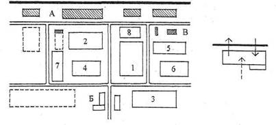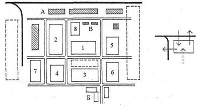 Рис. 1.7. Схемы генеральных планов машиностроительного завода: 1 - литейный цех; 2 - кузнечно-прессовый цех; 3 - механический цех; 4 - цех металлоконструкций; 5 - инструментальный цех; 6 - термический цех; 7 - сборочный цех; 8 - модельный цех; А - складские помещения; Б - общезаводские; В - энергетическое хозяйство