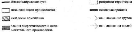 1.2. Генеральный план предприятияГенеральный план завода является одной из важнейших составных частей проекта, где комплексно развиваются вопросы планировки, застройки и благоустройства территории (рис. 1.7). При проектировании генерального плана необходимо знакомство с существующими решениями аналогичных предприятий в отечественной и зарубежной практике. Площадка предприятия по его функциональному использованию делится на следующие зоны: предзаводскую; производственную; подсобную; складскую. Главный вход на предприятие следует предусмотреть со стороны основного подхода или подъезда рабочих к предприятию. Расстояние от проходных пунктов до выходов в бытовые помещения основных цехов не должно превышать 800 м. При большем расстоянии предусматривается внутризаводской пассажирский транспорт. Предприятие площадью более 5 га должно иметь не менее двух въездов, расстояние между которыми не превышает 1,5 км. Расстояния между зданиями и сооружениями следует принимать наименьшими в соответствии с технологическими условиями, но не менее норм, установленных противопожарными и санитарно-гигиеническими требованиями. Коэффициент плотности застройки должен быть не менее 0,6. Производственные, подсобные и вспомогательные здания, а также закрытые склады целесообразно объединять в более крупные здания, когда такое объединение экономически обосновано по условиям производства, строительства, санитарной гигиены, безопасности и по противопожарным требованиям. Здания, сооружения, открытые установки, выделяющие в атмосферу газ, дым и пыль, а также взрывоопасные и пожароопасные объекты необходимо располагать по отношению к другим производственным зданиям с подветренной стороны для ветров преобладающего направления. Брызгальные бассейны располагают длиной перпендикулярно к преобладающему направлению летних ветров. Здания или сооружения располагают относительно сторон света и преобладающего направления ветров с учетом благоприятного естественного освещения, проветривания площадок предприятия, предотвращения снежных заносов и с соблюдением следующих требований: продольные стороны световых фонарей и основные стены с оконными проемами располагают под углом 45... 110° к меридиану; СХЕМА ГЕНПЛАНА №1