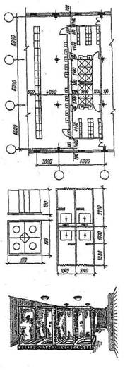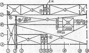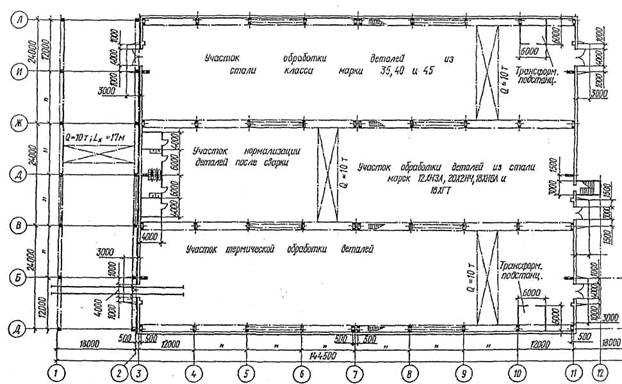 Рис. 1.10. Планировка термического цеха автомобильного завода 1.5. Конструктивные решения цехаПроектируемое производственное здание должно быть каркасного типа. Основные элементы каркаса могут приниматься железобетонными, металлическими или смешанными. Покрытие, играющее важную роль в архитектуре одноэтажных производственных зданий, может проектироваться из плоскостных, пространственных или смешанных конструкций. Стеновые ограждения проектируются самонесущими или навесными. Материалом стен могут служить железобетон в виде панелей различных конструкций, металл в виде стеновых панелей с эффективным утеплителем типа "Сэндвич", естественные и искусственные камни и др. Типовые габаритные размеры ворот в стенах для электрокаров, вагонеток и автомашин -3×3 м и 3×4 м. Высота здания цеха зависит от отметки головки рельса подкрановых путей, грузоподъемности крана, сетки колонн здания и конструкции покрытия. При конструировании покрытия цеха необходимо обращать внимание на выполнение водостока с крыши, который может оказать влияние как на конструктивное решение, так и на архитектурную выразительность цеха. Во всех случаях следует принимать систему внутреннего водоотвода. Однако допускается дополнительно к внутренним водостокам предусматривать наружные аварийные водостоки, которые могут обогащать фасады зданий. При устройстве верхнего освещения наиболее распространенные в России прямоугольные двусторонние П-образные коньковые продольные фонари удобны для производств с пыле-газо-и тепловыделениями. Однако они наиболее материалоемки, дороги, громоздки, а светоактивность их не очень высока. Большой интерес представляют фонари, входящие в состав несущей конструкции и покрытия, - зенитные, шедовые и др. Основные элементы каркаса и покрытия рекомендуется принимать по данным [13, 14]. Компоновка конструктивной схемы производственного здания осуществляется по рекомендациям [5]. Узлы сопряжений сборных конструкций могут выполняться по [14], а необходимые узлы сопряжений принимаются по заданию руководителя проекта. Примеры привязки и разрезы цеха см. на рис. 1.11, 1.12.