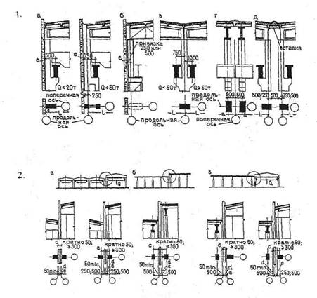 Рис. 1.11. Привязка элементов к разбивочным осям зданий и организация перепадов высот: 1. Привязка элементов к разбивочным осям зданий, оборудованных кранами: а - железобетонные колонны с шагом 6 или 12 м; б - стальные колонны; в - средние ряды колонн; г - поперечный температурный шов; д - продольный температурный шов. 2. Организация перепадов высот; а - вдоль пролета; б - поперек пролета; в взаимно перпендикулярные пролеты