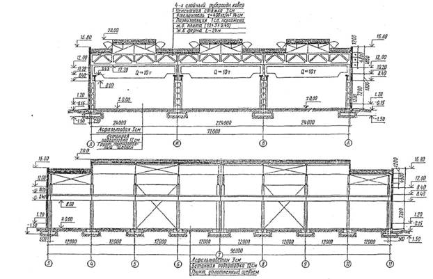 Рис. 1.17. Примеры графического оформления разрезов одноэтажного промышленного здания: а - поперечного; б - продольного а